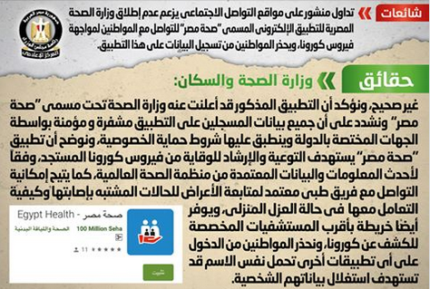 تداولت بعض مواقع التواصل الاجتماعي منشوراً يزعم عدم إطلاق وزارة الصحة المصرية للتطبيق الإلكتروني المسمى “صحة مصر و التواصل مع المواطنين لمواجهة ڤيروس كورونا، ويحذر المواطنين من تسجيل البيانات على هذا التطبيق، وقد قام المركز الإعلامي لمجلس الوزراء بالتواصل مع وزارة الصحة والسكان، والتي نفت تلك الأنباء تماماً، مُوكدةً أن التطبيق المذكور قد أعلنت عنه وزارة الصحة تحت مسمى “صحة مصر”، مُشددة على أن جميع بيانات المسجلين على التطبيق مشفرة ومؤمنة بواسطة الجهات المختصة بالدولة وينطبق عليها شروط حماية الخصوصية، مُوضحةً أن تطبيق “صحة مصر” يستهدف التوعية والإرشاد للوقاية من ڤيروس كورونا المستجد، وفقاً لأحدث المعلومات والبيانات المعتمدة من منظمة الصحة العالمية، كما يتيح إمكانية التواصل مع فريق طبي معتمد لمتابعة الأعراض للحالات المشتبه بإصابتها وكيفية التعامل معها في حالة العزل المنزلي، ويوفر أيضاً خريطة بأقرب المستشفيات المخصصة للكشف عن كورونا، مُحذرةً المواطنين من الدخول علي أي تطبيقات أخرى تحمل نفس الاسم قد تستهدف استغلال بياناتهم الشخصية.