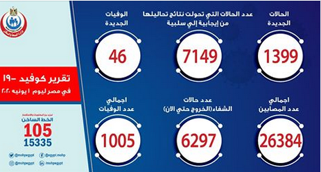 و أشار البيان إلى أنّ عدد الحالات التي ّنتائج تحاليلها معمليًا من إيجابية إلى سلبية لفيروس كورونا (كوفيد- ١٩) ارتفع ليصبح ٧١٤٩حالة و تسجيل ١٣٩٩حالة جديدة ثبتت إيجابية تحاليلها معمليًا للفيروس، وذلك ضمن إجراءات ّوالتقصي التي تُجريها الوزارة وفقًا لإرشادات منظمة الصحة العالمية و وفاة ٤٦ حالة جديدة.