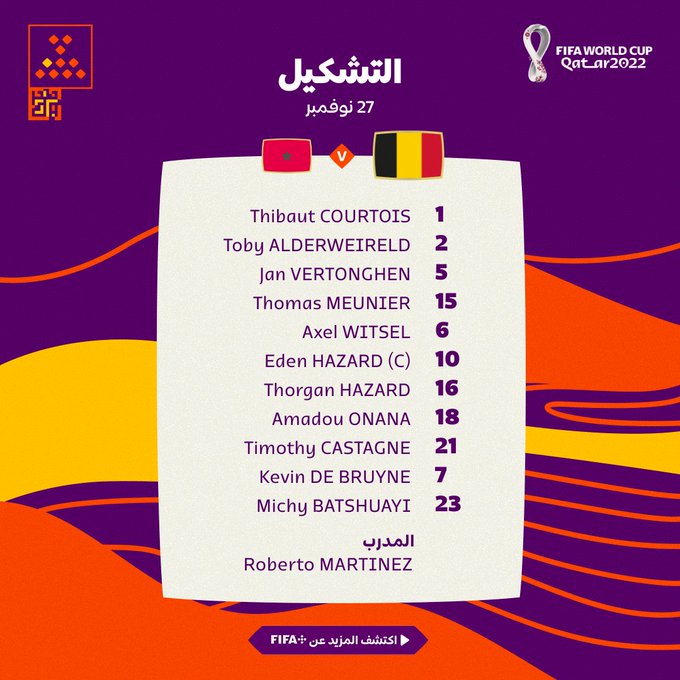 تشكيلة منتخب بلچيكا و المغرب في بطولة كأس العالم FIFA قطر في نسخته الـ ٢٢ ــ اليوم :
