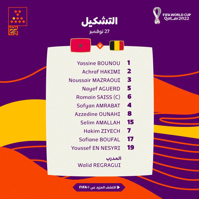 تشكيلة منتخب المغرب أمام بلچيكا في بطولة كأس العالم FIFA قطر في نسخته الـ ٢٢ ــ اليوم :