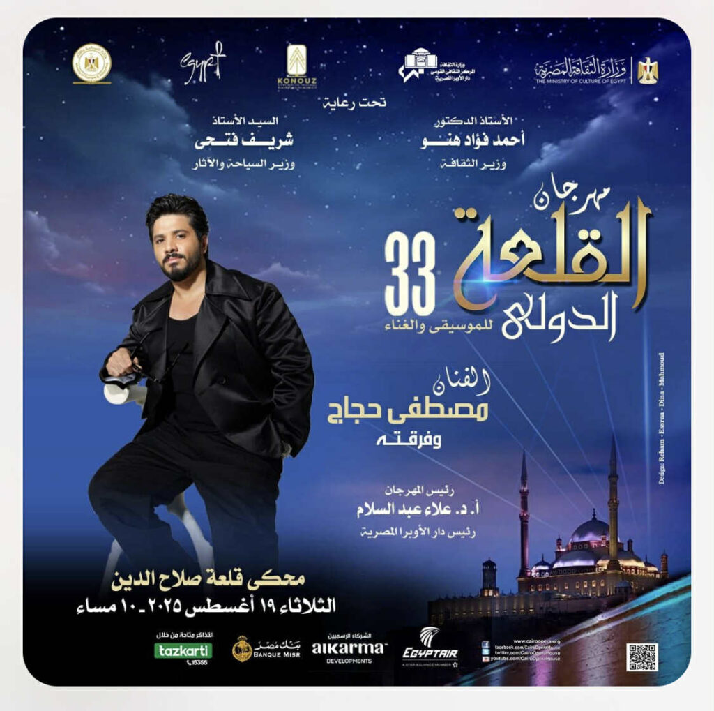 في أمسية فنية مبهرة تجمع بين عبق التاريخ وروعة الموسيقى، حيث تتألق الألحان في قلب القاهرة وتحت سماءها الصافية يلتقي جمهور القلعة في حفل افتتاح المهرجان يوم الجمعة ١٥ أغسطس ٢٠٢٥ بمسرح محكى قلعة صلاح الدين مع :