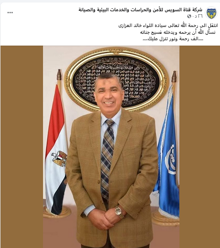 وافت المنية منذ قليل اللواء خالد سعيد العزازي، مستشار رئيس الهيئة للإعلام والعلاقات، ورئيس مجلس إدارة شركة قناة السويس للأمن والحراسات،فقد نشرت صفحة شركة قناة السويس للأمن والحراسات والخدمات البيئية والصيانة عبر الفيسبوك خبر نعيه .