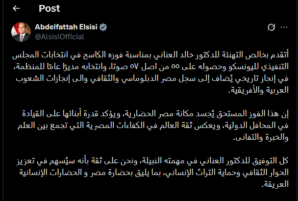 أتقدم بخالص التهنئة للدكتور خالد العناني بمناسبة فوزه الكاسح في انتخابات المجلس التنفيذي لليونسكو وحصوله على ٥٥ من اصل ٥٧ صوتا، وانتخابه مديرًا عامًا للمنظمة، في إنجاز تاريخي يُضاف إلى سجل مصر الدبلوماسي والثقافي والى إنجازات الشعوب العربية والأفريقية.
