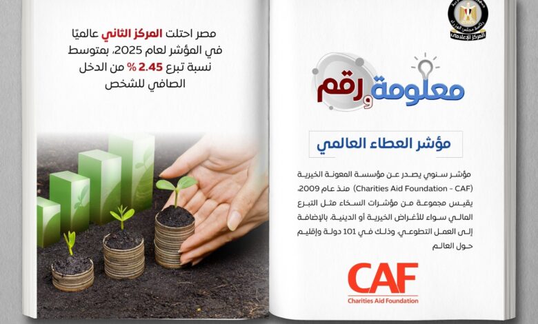 مصر تحتل المركز الثاني عالمياً في مؤشر العطاء لعــام ٢٠٢٥