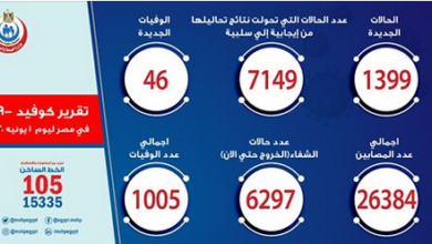 بيان الصحة : إرتفاع إجمالي المتعافين من ڤيروس كورونا إلى ٦٢٩٧حالة حتى اليوم و المحافظات التي سجلت أعلى معدل إصابات بڤيروس كورونا هي “القاهرة، الجيزة والقليوبية “