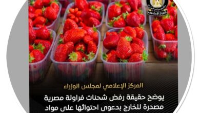 المركز الإعلامي لرئاسة الوزراء ينفي تماماً ما تم تداوله بشأن رفض شحنات فراولة مصرية مصدرة للخارج بدعوى احتوائها على مواد…
